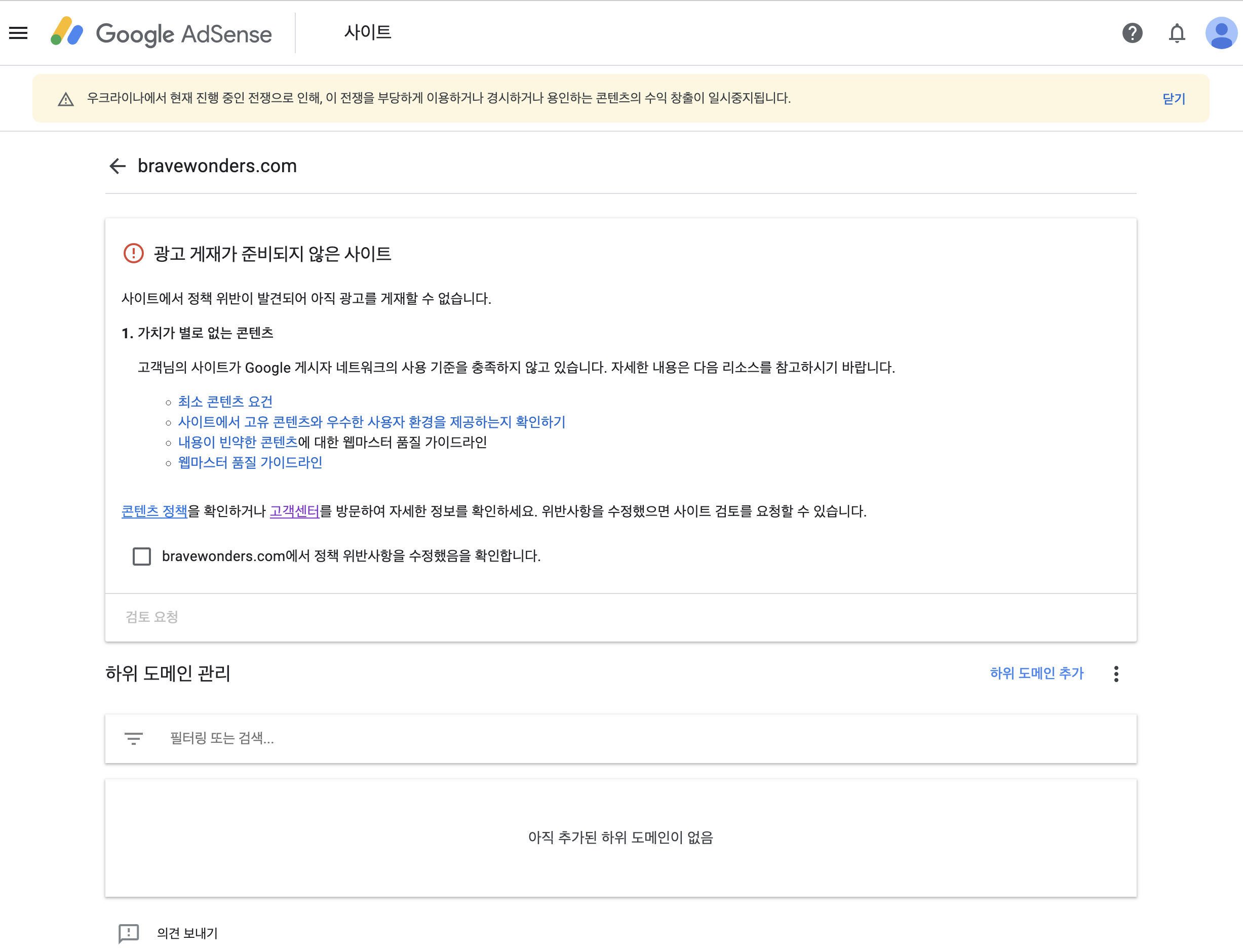 구글 애드센스 정책이 까다롭다는 얘기를 많이 들었고 다른 분들의 후기도 나름 찾아봤어서 구글 애드센스 고시 라고 부르는 것도 알고 있었지만 나름 클린하게 글을 쓰고 열심히 포스팅의 개수를 늘리면 어느정도 희망이 있지 않겠냐 하는 생각을 하고 있었거든요.