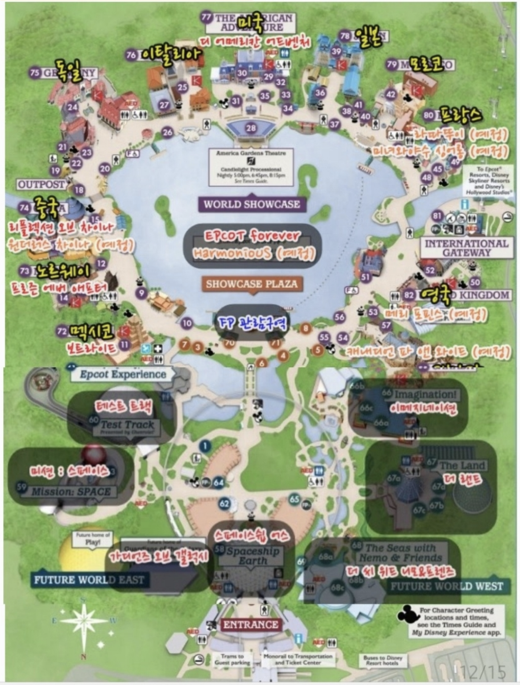 - 추천 포인트: 놀이기구 보다는 세계 각국의 문화(11개국)를 한 자리에서 즐길 수 있다는 것에 의의를 두시는 분 이라면 추천 드립니다. 정말 몇 걸음 걷지 않아도 멕시코, 중국, 독일, 일본, 캐나다 등 여러 국가로 넘어가며 문화를 체험 해 볼 수 있습니다. 게다가 우주, 바다, 땅, 하늘, 자동차, 에너지 와 같은 다소 엑스포에 있을 법한 주제들로 만들어진 어트렉션 들이 있어 관심 있는 분들께 추천 드립니다. 추천 드리는 어트렉션은 '겨울왕국' 과 '니모를 찾아서' 정도가 될 듯 합니다. 저녁에 진행 되는 불꽃놀이와 레이져쇼는 오히려 매직킹덤보다 낫다라는 평도 있습니다.