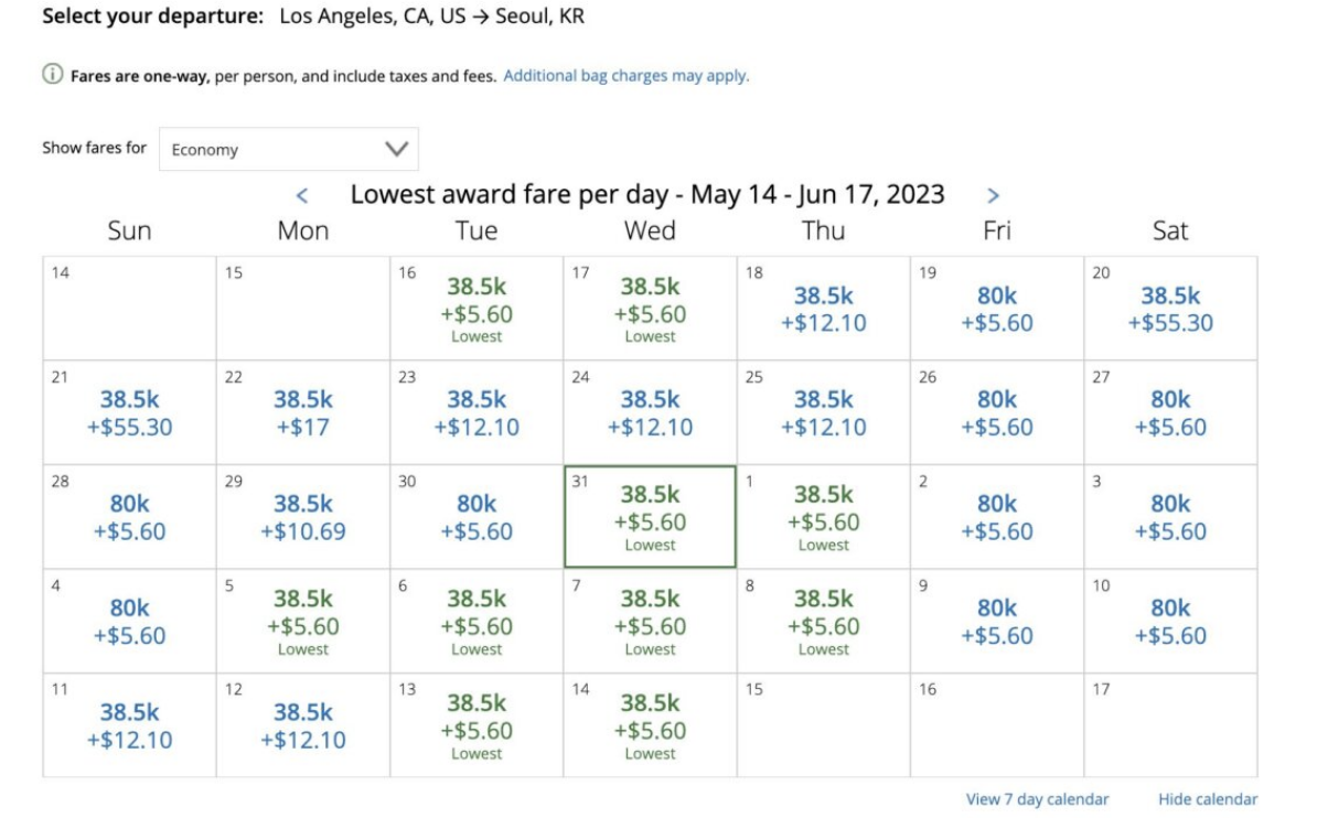 실제 2023년 5월말 6월초(극성수기) LA-서울 4인 가족 편도 검색을 하면, 1번의 경유를 해야 하는 여정으로 검색이 되기는 하지만 3.85만 마일에 마일리지 발권이 가능하다는 것 자체가 놀라운 일 입니다.