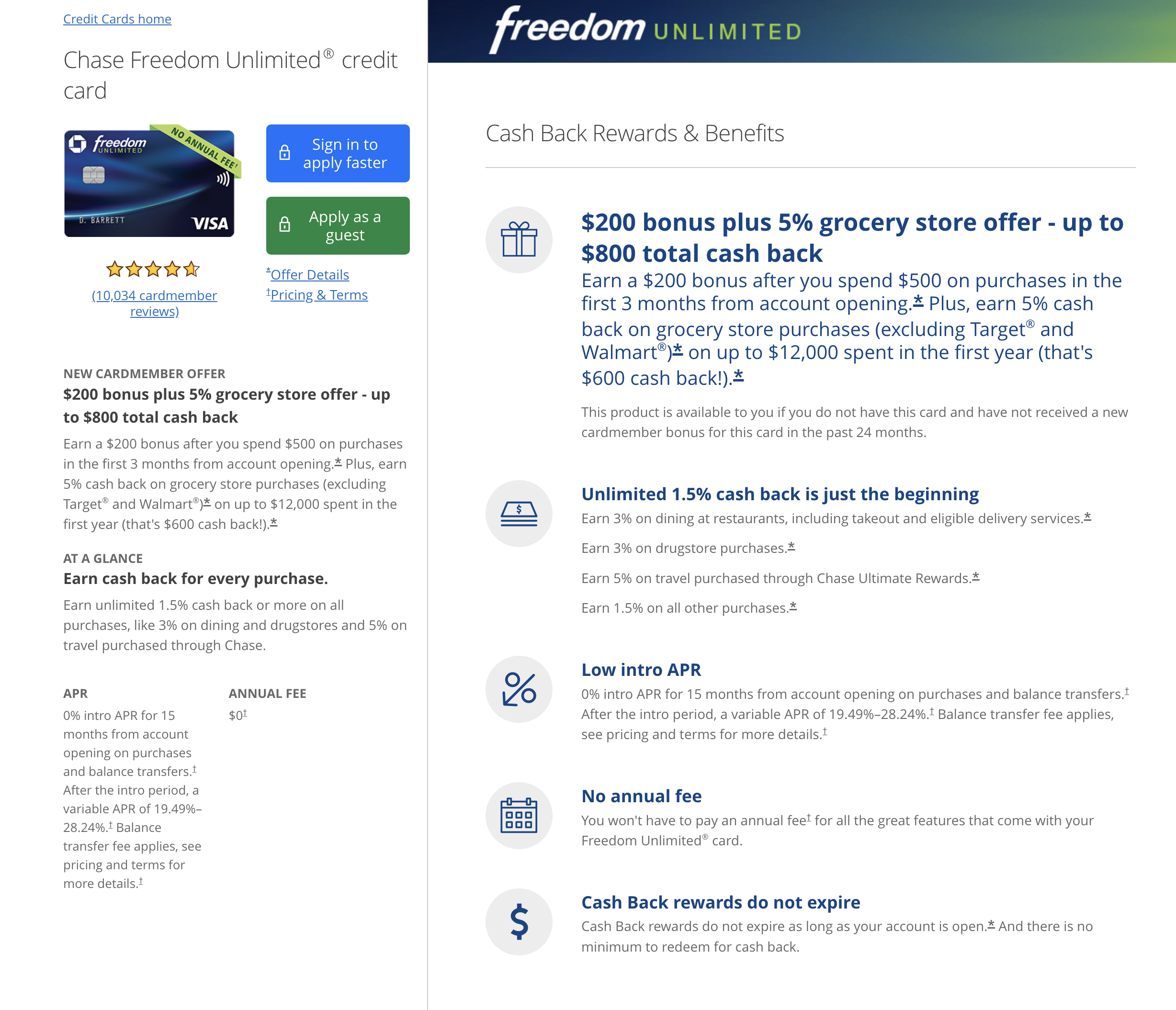 일단 프리덤 언리미티드(Freedom Unlimited) 카드의 경우 연회비가 없고 저처럼 장보는데 카드를 많이 쓰는 주부의 경우 매우 사용하기 좋은 카드이기 때문 입니다. (타겟과 월마트를 제외한 식료품점에서 구매 시 5% 캐쉬백 적용) 그리고 연회비 무료인 카드에 1.5% 캐쉬백은 큰 혜택이라고 생각합니다. APR 비율도 낮구요. 실은 Sapphire Reserve는 APR 비율은 좀 높아요...