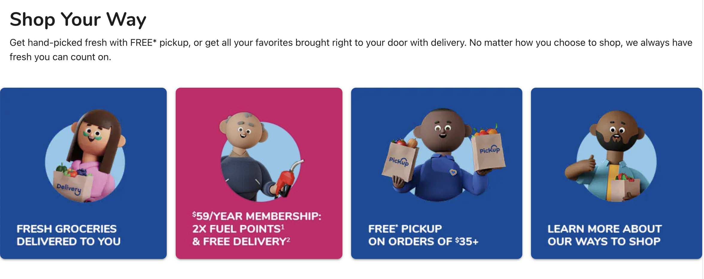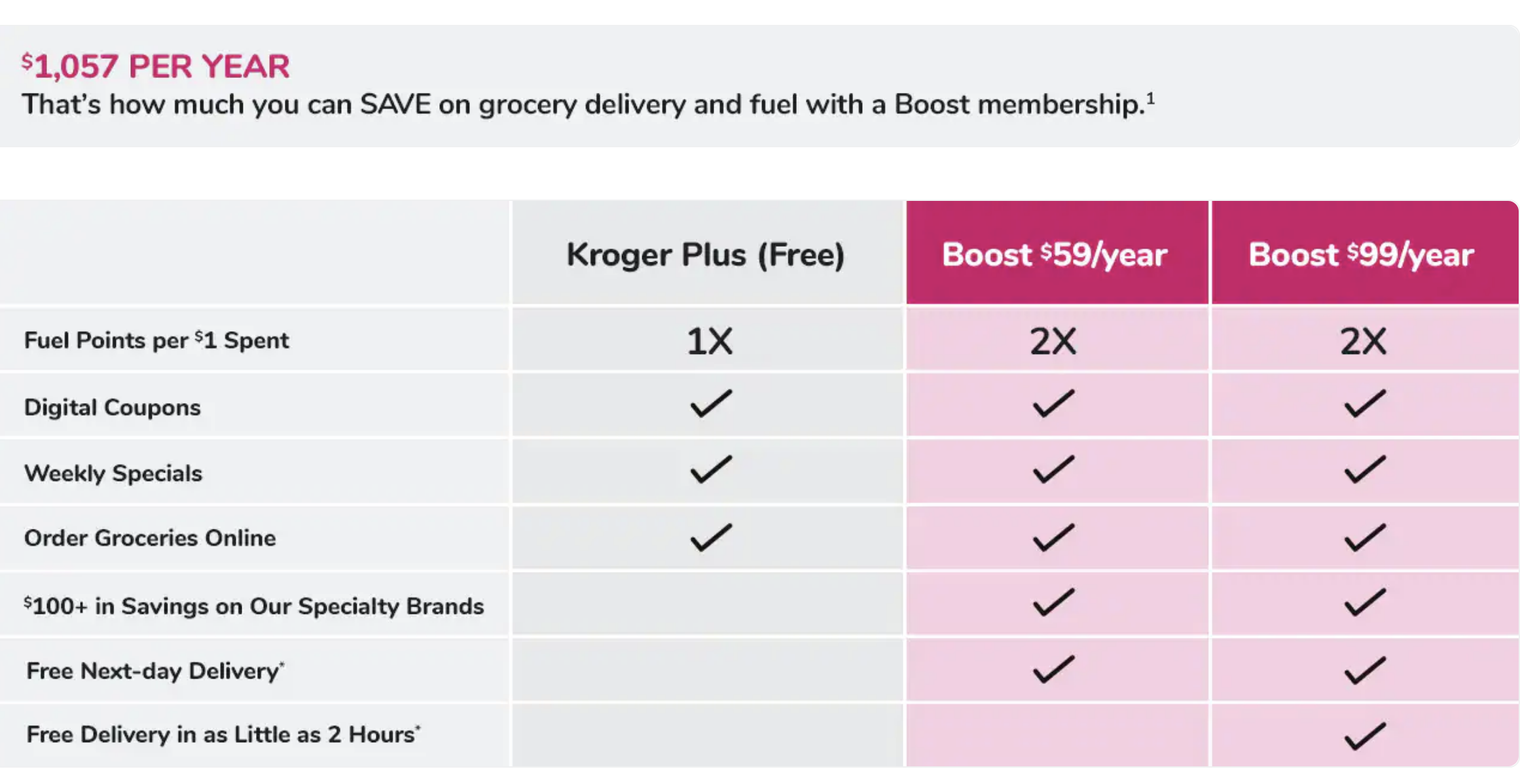 Boost 라는 맴버십 프로그램으로 연간 $59, $99로 무료 포인트 적립 카드는 달러당 1 Fuel Point가 적립 되었다면 유료 맴버십은 달러당 2 Fuel point가 적립 되고 차별화된 제품 할인 안내와 Free Next-day delivery가 포함 된 것도 차별화 된 전략으로 보여 집니다.